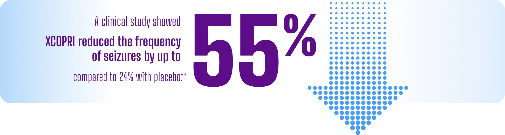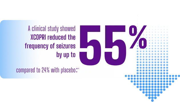 During an 18-week study (6-week titration phase and 12-week maintenance phase) when participants were taking either XCOPRI or placebo (sugar pill), which was added to their anti-seizure medication to treat partial-onset seizures, seizures were reduced by: 55% with 400 mg, 55% with 200 mg, 36% with 100 mg, vs. 24% with placebo.